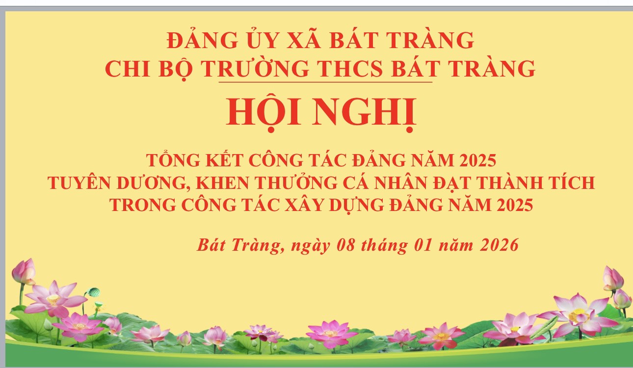 Sáng ngày 8/1/2026, Chi bộ trường THCS Bát Tràng tổ chức Hội nghị tổng kết và khen thưởng cá nhân đạt thành tích xuất sắc trong công tác Đảng năm 2025. Hội nghị tổng kết trong năm 2025, chi bộ đã được Đảng uỷ xã đánh giá xếp loại chi bộ hoàn thành xuất sắc nhiệm vụ. Chi bộ đã tuyên dương, khen thưởng cho các đồng chí đảng viên hoàn thành xuất sắc nhiệm vụ và hoàn thành tốt nhiệm vụ trong công tác xây dựng Đảng năm 2025. Hội nghị đã ghi nhận sự nỗ lực, cố gắng của tập thể chi bộ cũng như các đ/c đảng viên trong các hoạt động của Đảng như sinh hoạt chi bộ, thực hiện công tác xây dựng Đảng và các nhiệm vụ chuyên môn khác,…