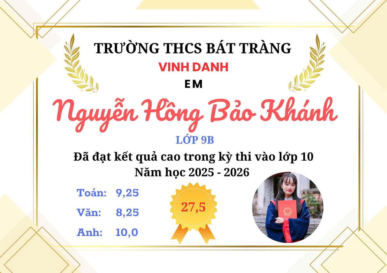 Tiếp nối thành tích xuất sắc của trường THCS Bát Tràng đặc biệt trong kì thi vào lớp 10 THPT công lập năm học 2025- 2026 của thành phố Hà Nội được công bố cũng là lúc thầy và trò trường THCS Bát Tràng đón nhận những trái chín của mùa quả ngọt. Trong đó em : Nguyễn Hồng Bảo Khánh với tổng số điểm 27,5 trong đó điểm 10 tuyệt đối môn Tiếng Anh. và rất nhiều học sinh đạt điểm từ 24 đến 27.5.