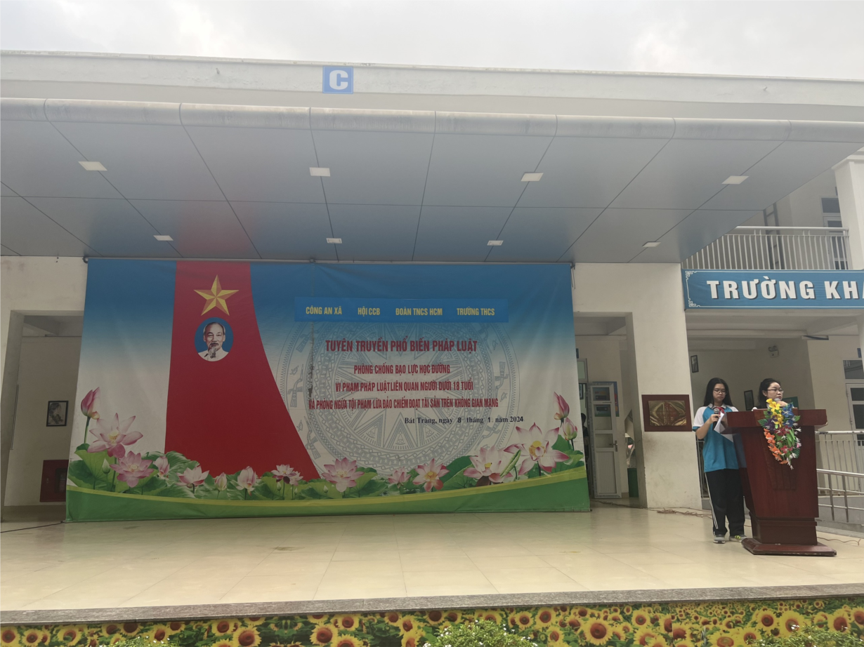 Sáng nay, ngày 8/1/2024, trường THCS Bát Tràng tổ chức chào cờ tuần 19 và tuyên truyền phổ biến pháp luật cho học sinh với nội dung" Phòng chống bạo lực học đường, vi phạm pháp pháp luật với người dưới 18 tuổi và phòng ngừa tội phạm lừa đảo trên không gian mạng xã hội"